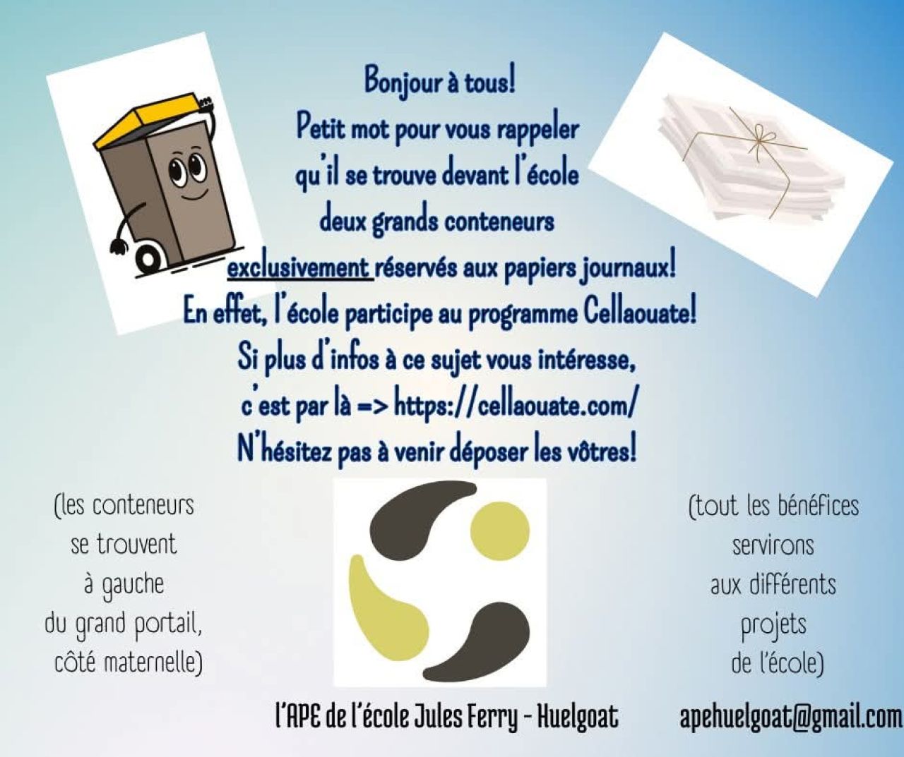 Comme chaque année, nous collectons du papier journal que l'entreprise cellaouate récupère pour isoler des maisons. Le bénéfice sert aux activités de l'école.